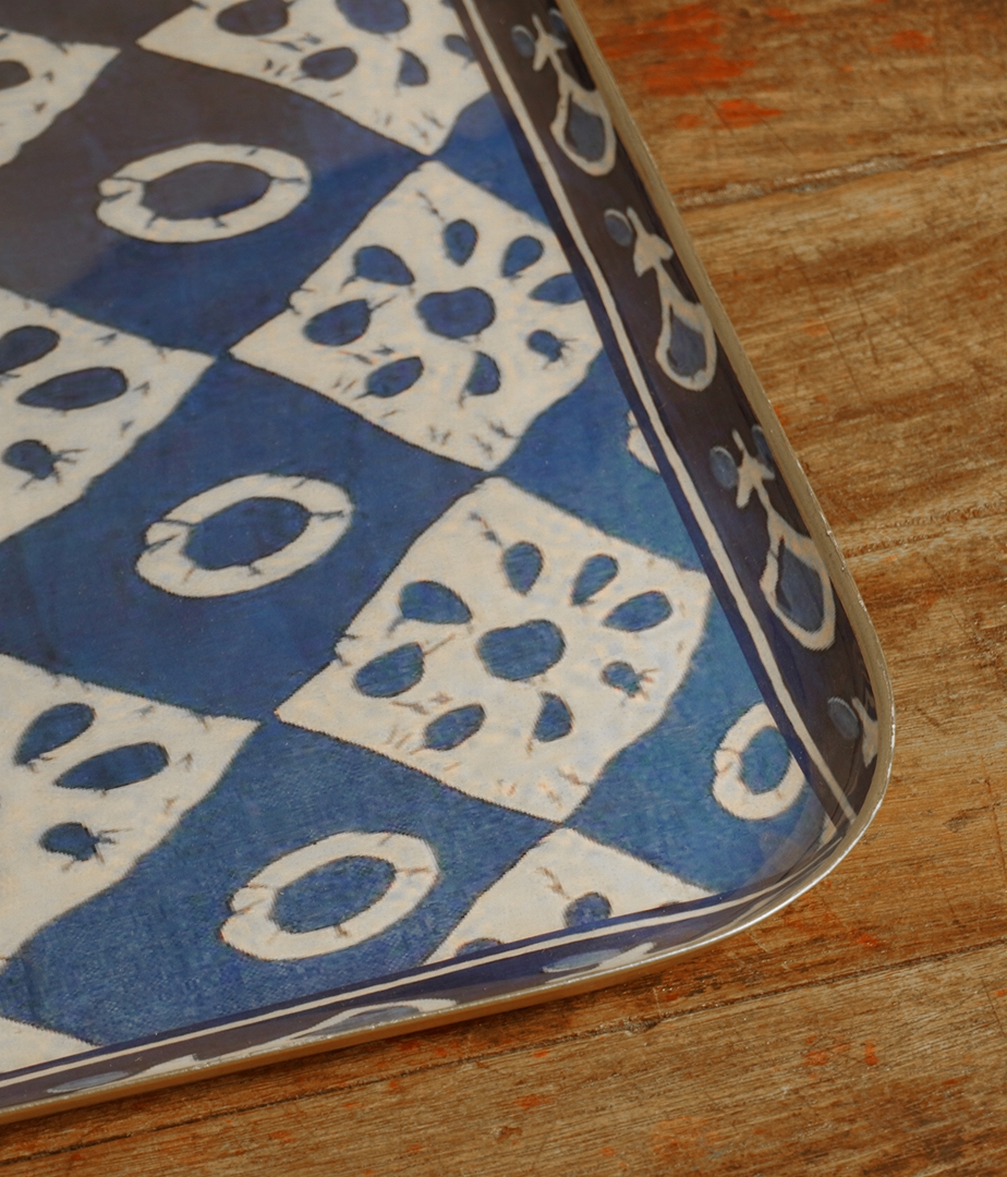 Bandeja rectangular con estampado geométrico en azul y blanco, borde dorado y acabado brillante. Ideal para servir, decorar o dar un toque mediterráneo y vibrante a cualquier espacio. Una pieza llamativa y versátil para el día a día.
