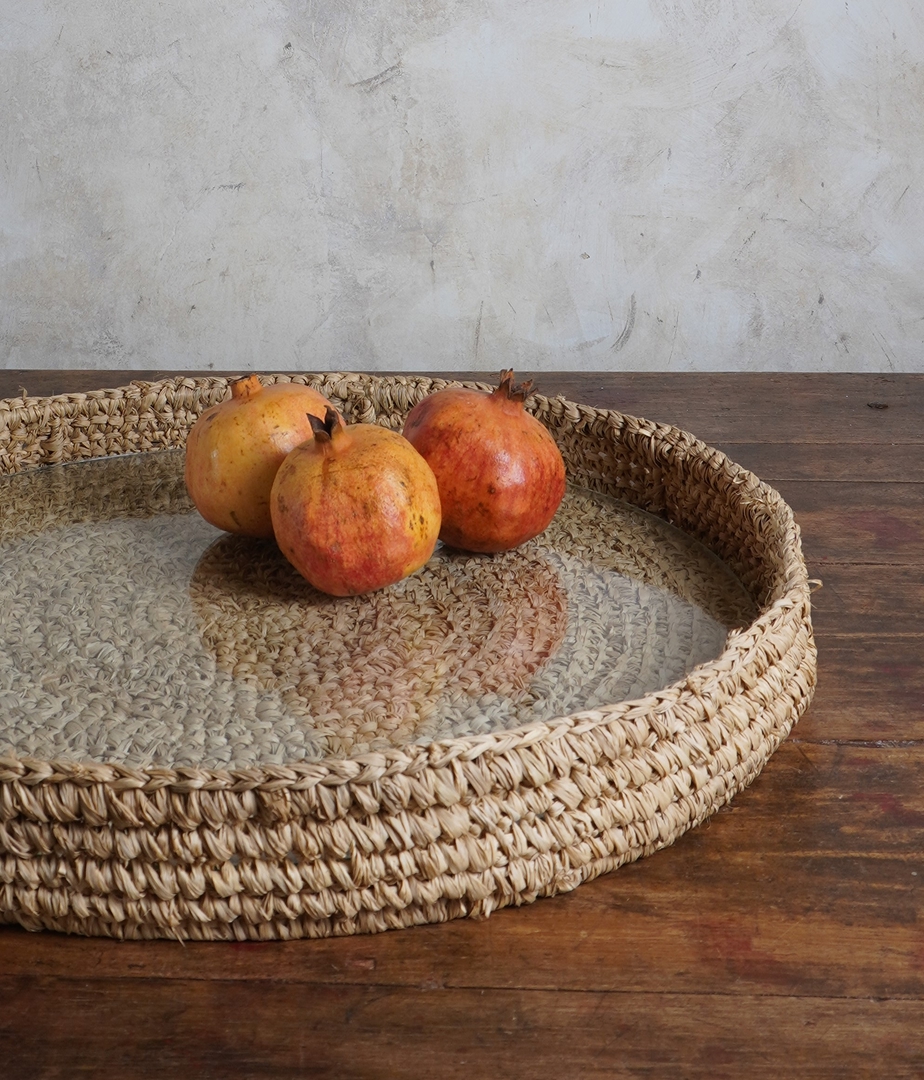 Bandeja redonda artesanal de fibras naturales con base trenzada y borde elevado. Ideal para decorar mesas, organizar objetos o servir con estilo. Su acabado rústico y cálido aporta un toque natural a cualquier ambiente.