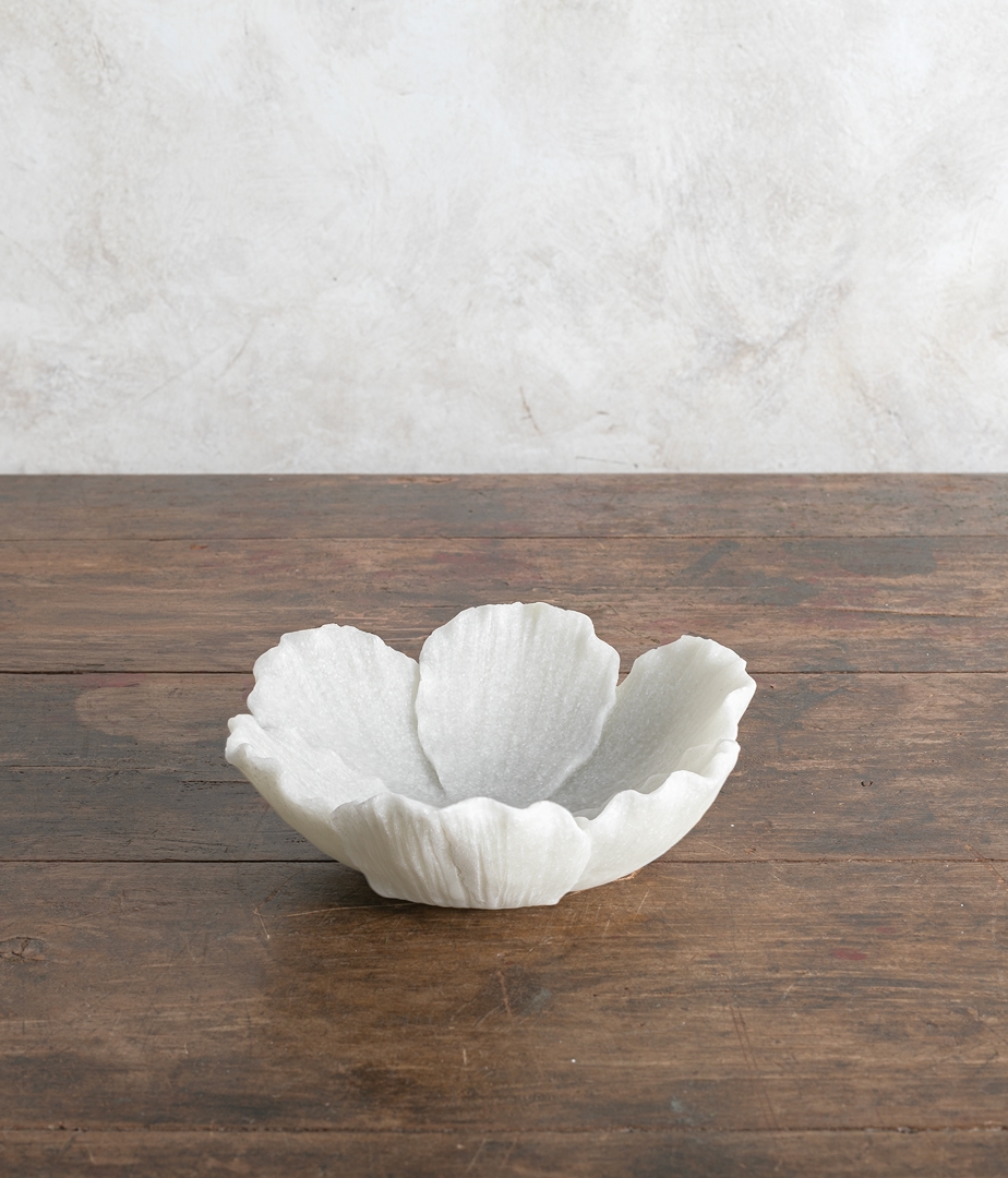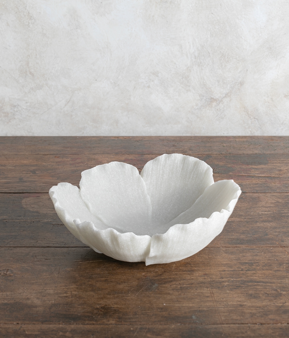 Centro decorativo de diseño en forma de flor elegante y atemporal que destaca en cualquier ambiente de decoración con un acabado rugoso en un blanco roto similar al alabastro.