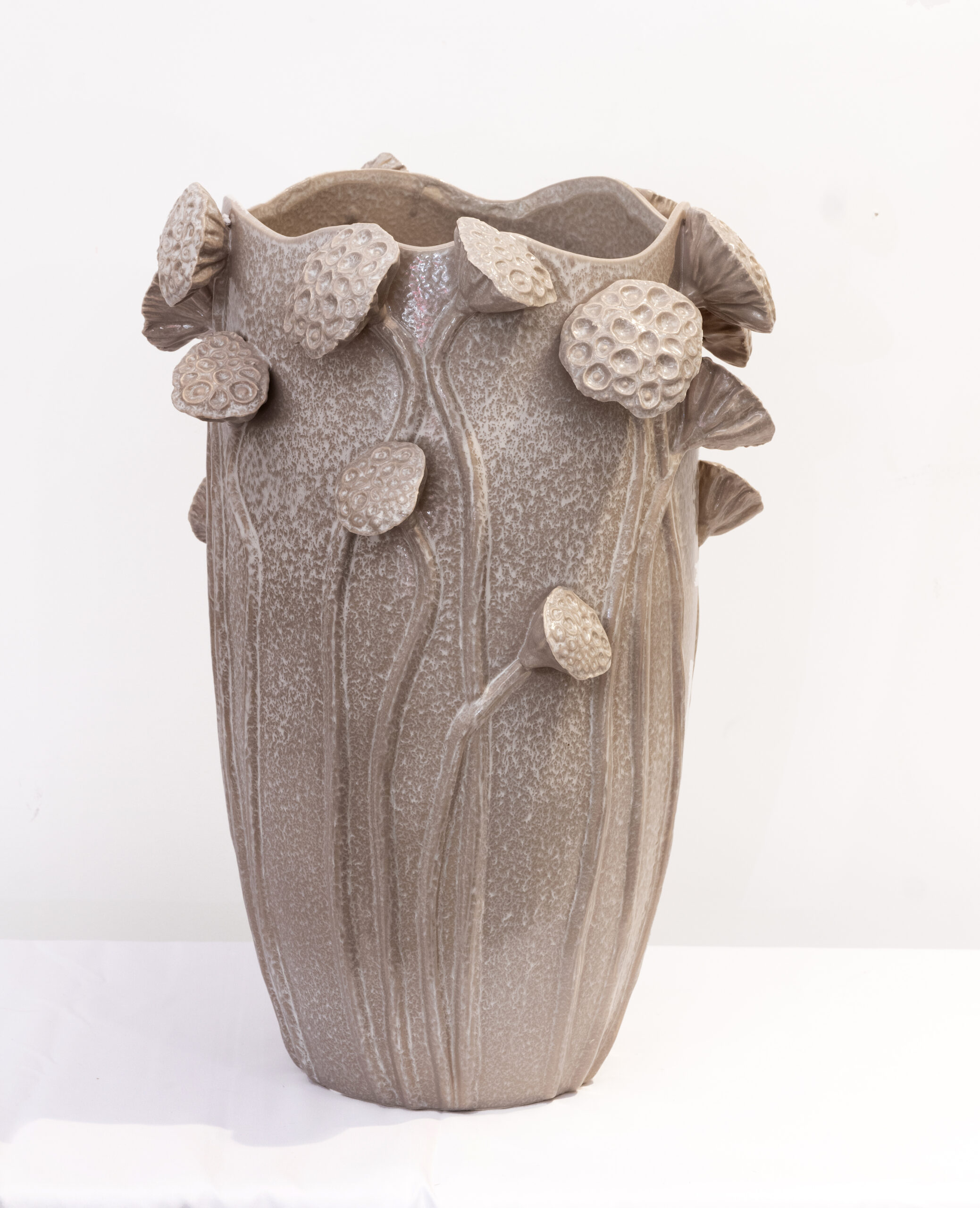 Jarrón cerámico en tonos grises con frutos en relieve. Diseño artesanal de inspiración natural para una decoración elegante.