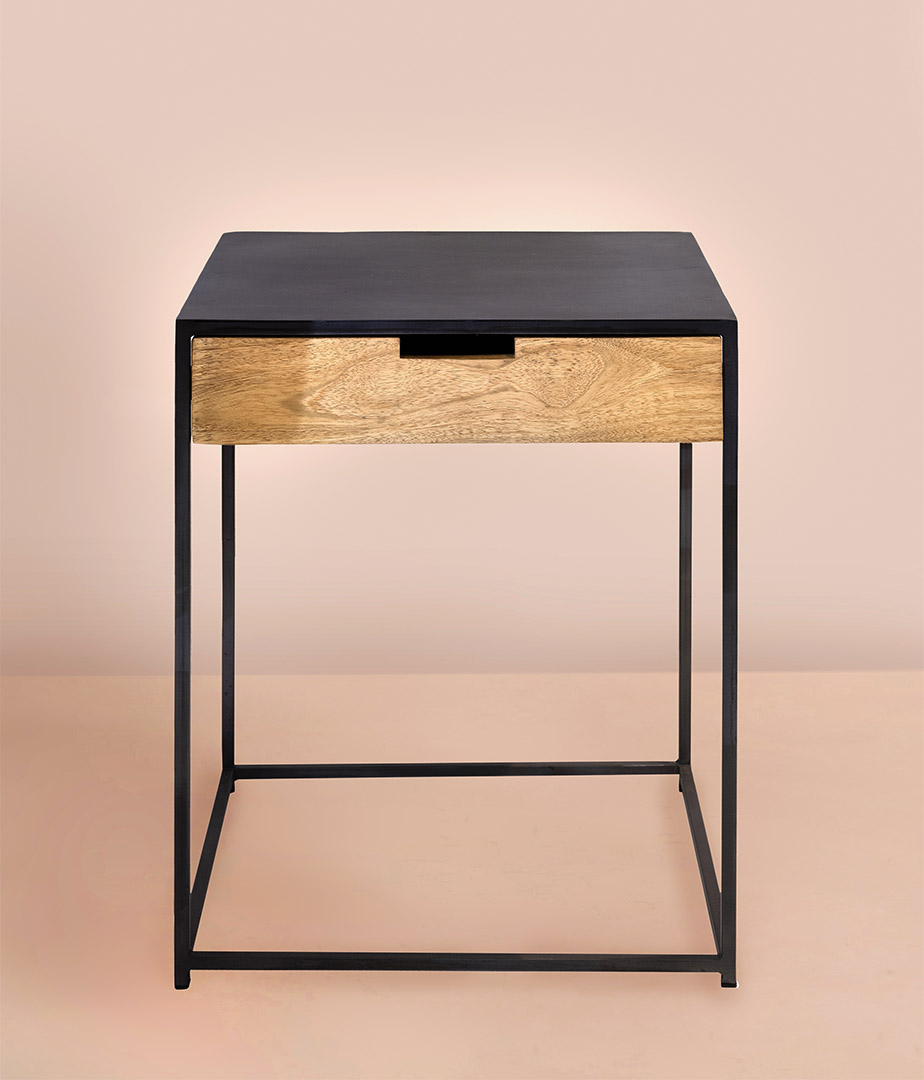 Mesa auxiliar redonda de diseño actual y a la vez ligero que aporta delicadeza y estilo en cualquier espacio de decoración con pie en metal acabado rugoso negro y tapa en mármol veteado en negro