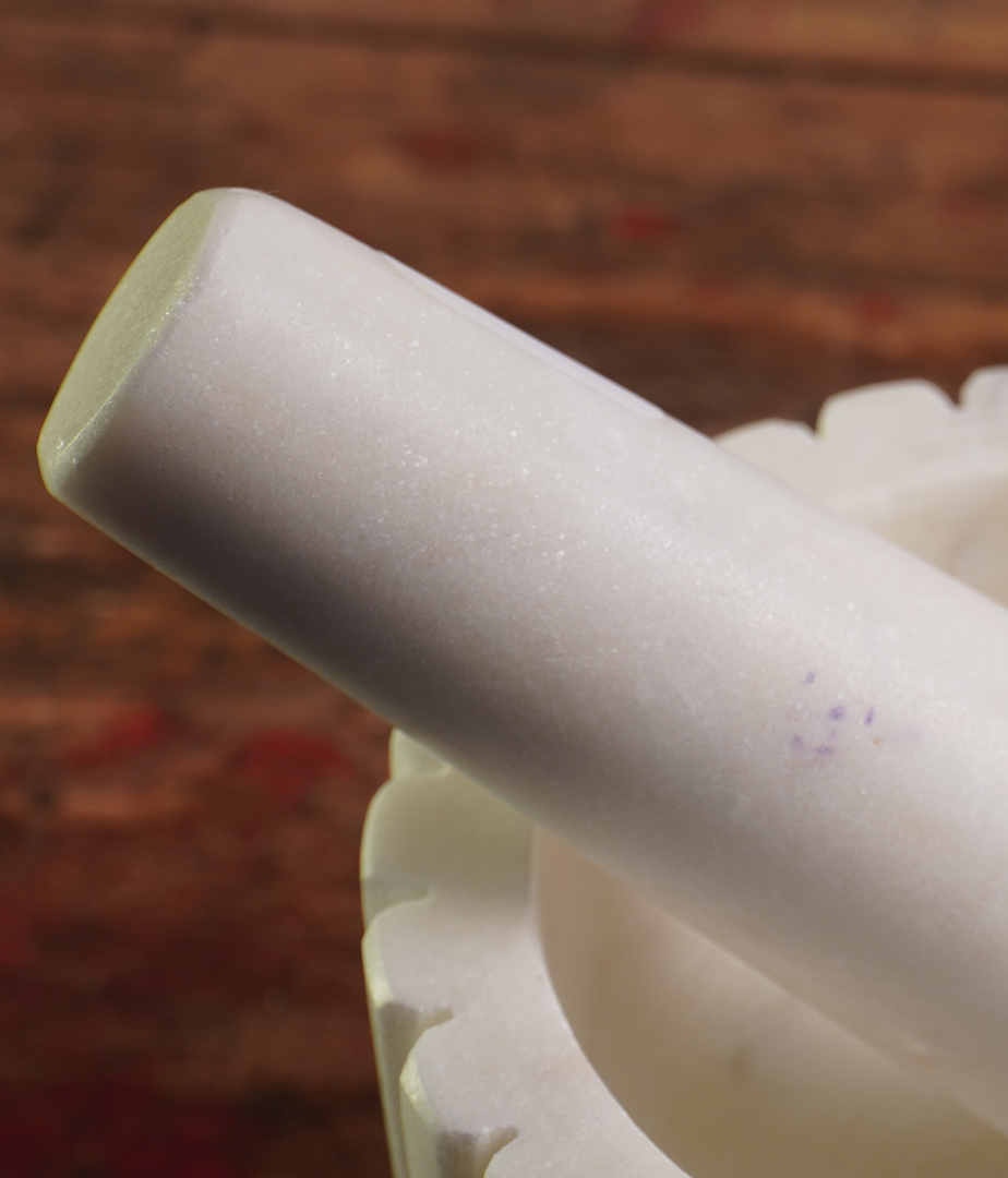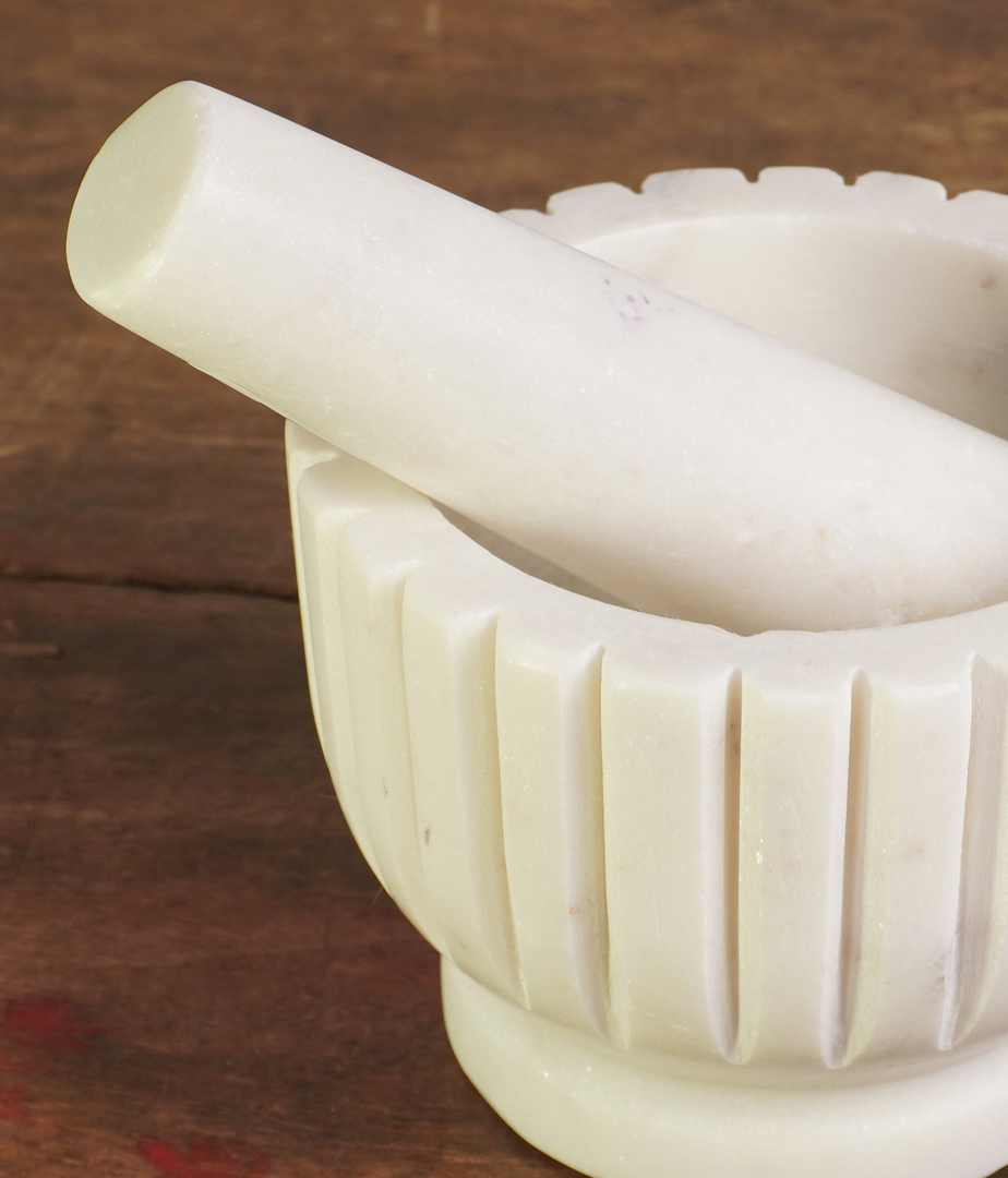 Mortero de mármol blanco con diseño estriado y mazo a juego. Robusto, elegante y perfecto para triturar especias, hierbas y preparar aliños de forma tradicional. Una pieza decorativa y funcional que aporta un toque natural y artesanal a la cocina.