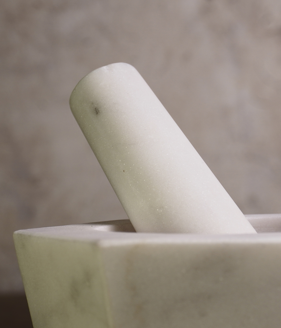 Mortero de mármol blanco con mazo a juego, robusto y elegante. Ideal para moler especias,hierbas y preparar aliños de forma tradicional. Su diseño geométrico y acabado natural lo convierten en una pieza funcional y decorativa para cualquier cocina.