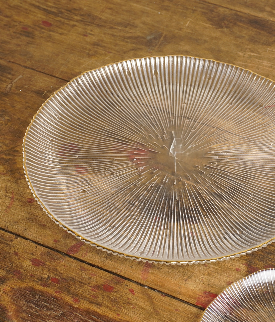 Plato de vidrio estriado con borde dorado