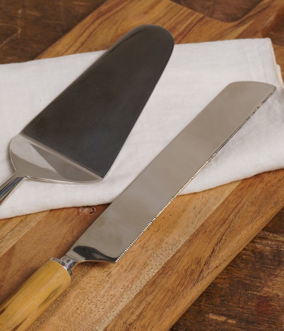 Set de pala y cuchillo para tartas con mango de bambú natural y hoja de acero inoxidable. Un conjunto elegante y funcional, ideal para servir tartas, postres y celebraciones especiales. Aporta un toque cálido y sofisticado a cualquier mesa o evento.