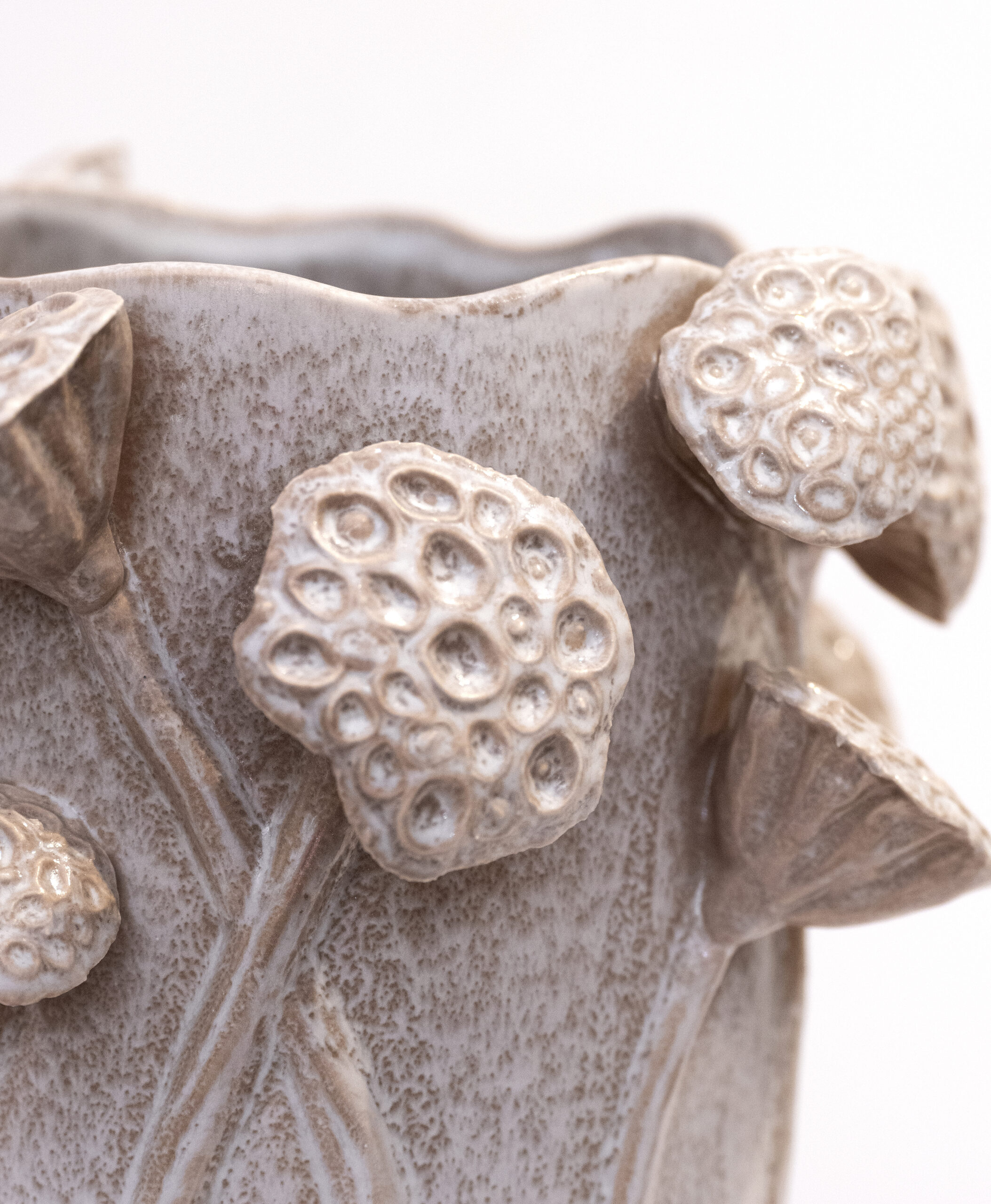 Jarrón cerámico en tonos grises con frutos en relieve. Diseño artesanal de inspiración natural para una decoración elegante.